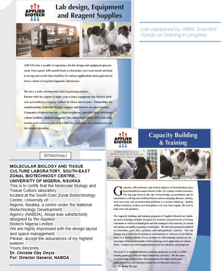 APPLIED BIOTECH NIGERIA TRAINING THE REQUISITE WORKFORCE FOR MOLECULAR BIOLOGY APPLICATIONS AT A LAB THEY DEVELOPED AT THE NATIONAL BIOTECH DEVELOPMENT AGENCY (NABDA), AIRPORT RD, ABUJA.